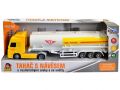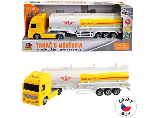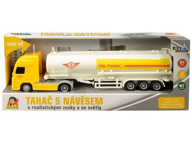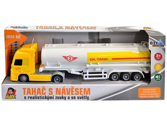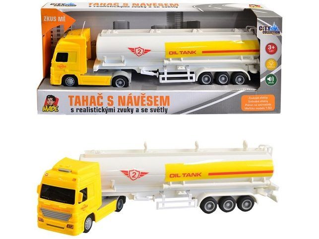 Kamion cisterna na setrvačník se světelnými a zvukovými doplňky z kolekce City collection. Český box o rozměrech 36,5 x 7,5 x 14,5 cm. Kamion má rozměry 8 x 33 x 5 cm. Měřítko 1:50. Pohon na setrvačník, světelné a zvukové doplňky. Napájení: baterie 3 x AG 13 knoflíkové (jsou součástí). Vhodné pro děti od 3 let.
