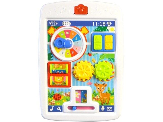 Posouvání okénkem se zvířátky, tlačítka se zvuky, hodiny, točící válečky. Velikost cca 21 cm. Baterie 2 x AAA 1,5 V jsou součástí balení. Vhodné pro děti od 18 měsíců.