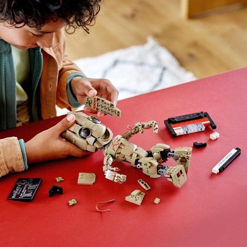 Každý fanoušek filmu Strážci galaxie Vol. 2 studia Marvel si jistě vzpomene na slavnou scénu, v níž malý Groot tančí. Nyní si ji děti mohou spolu s ostatními momentkami připomenout díky této propracované, pohyblivé replice rozkošného, ale rozpustilého Groota. Pohyblivý model lze jednoduše polohovat a potěší také kazetou s fiktivní hudbou! Kromě toho je zde bezplatná aplikace s návody na stavění LEGO, která dětem umožňuje prohlížet, přibližovat a otáčet si model, což přispívá k prohloubení zážitku a interakce během procesu stavění