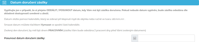 Vámi vybrané zboží vložte klasicky do ,,NÁKUPNÍHO KOŠÍKU", přepněte se do ,,NÁKUPNÍHO KOŠÍKU", vyplňte veškeré informace a volby, které jsou od Vás požadovány a na závěr vyplňte v sekci ,,Datum doručení zásilky" kolonku ,,Posunout datum doručení zásilky" datum můžete vepsat ručně ve tvaru dd.mm.rrrr (např. 21.12.2013) nebo použít kalendář, který se zobrazí po kliknutí do obdélníčku.