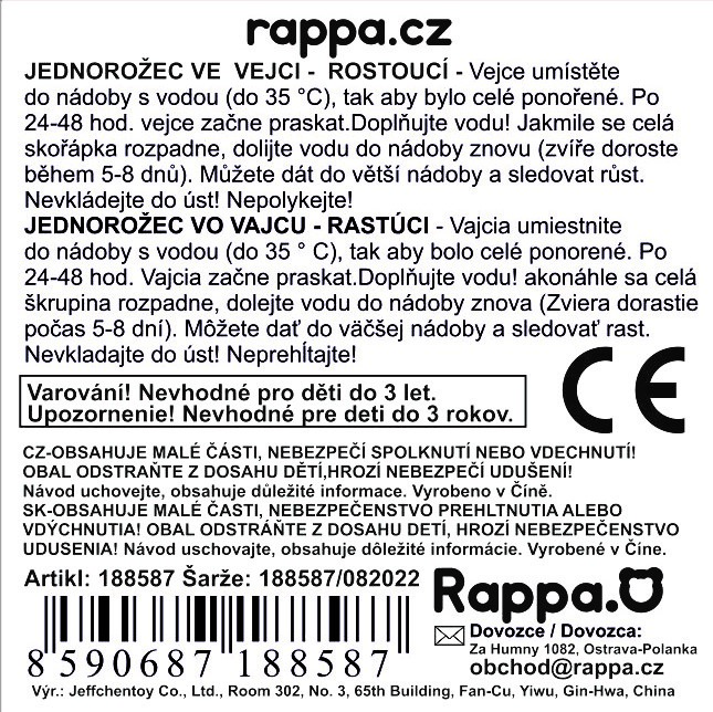 Vložte vejce do nádoby. Nádobu naplňte vodou tak, aby bylo vejce celé pod vodou. Po 24-48 hodinách začne vejce praskat. Jednorožec doroste během 5-8 dnů. Vajíčko je veliké cca 6 cm.