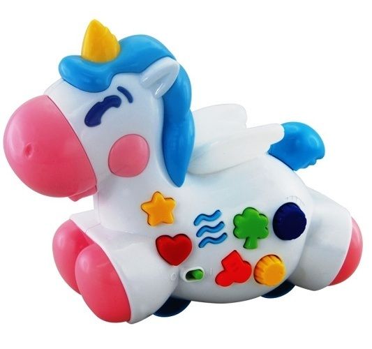 Interaktivní jednorožec pro ty nejmenší. Jednorožec má několik funkcí, vydává různé zvuky, svítí. Pokud jednorožce zmákneš, on půjde. Hračka obsahje také regulátor zvuku. Výrobek je vhodný pro děti od 12 měsíců. Vyžaduje 2 AG13 baterie.