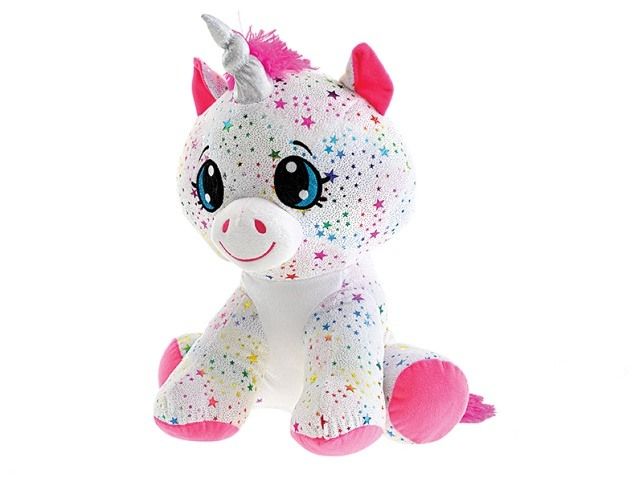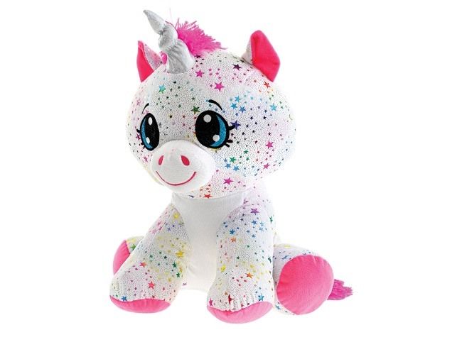 Krásný jednorožec o velikosti 24 cm v sedící poloze ohromí děti na první pohled svým provedením. Jednorožec je velmi oblíbeným zvířátkem všech dětí. Tento jednorožec je navíc ozdoben krásnými barevnými hvězdičkami a třpytkami.