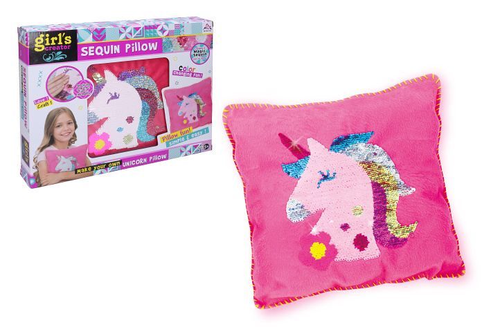 Jednorožec ušij si polštář s flitry. Velikost polštáře 30 x 30 cm. Návod na obalu. Balení obsahuje látku, nitě, plastovou jehlu, bavlnu.