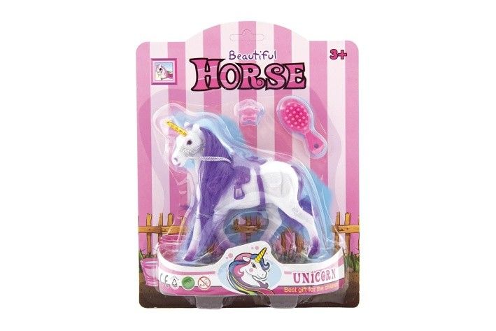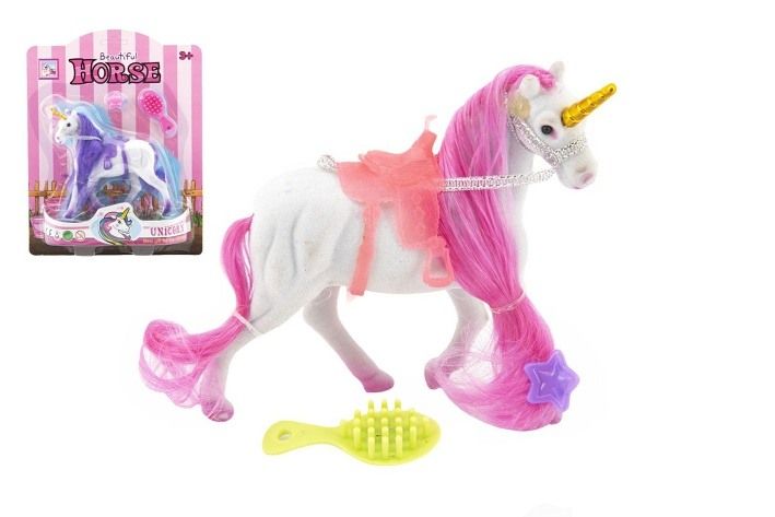 Krásný jednorožec v sadě s hřebenem a sponkou. Jednorožec má krásnou hřívu a ocas, který můžete česat. Ideální dárek pro všechny obdivovatele a milovníky koní. Jednorožec je plastový s povrchovou úpravou fliška.