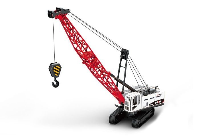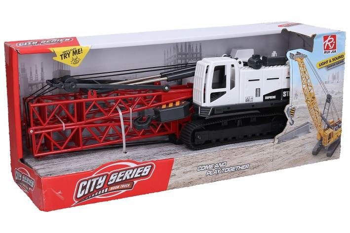 Jeřáb pásový s efekty. Velikost 42 cm. Vydává světelné a zvukové efekty. Aktivace tlačítky na střeše. Baterie 3xAG13, součástí balení.