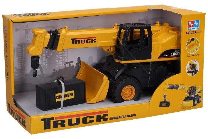 Jeřáb s efekty na setrvačník set kontejner. Rozměry 31x12,5x14,8 cm. Balení obsahuje jeřáb a kontejner 8,5 cm. Na setrvačník. Vydává zvukové efekty, aktivace tlačítky na střeše. Baterie 3xAG13, součástí balení.