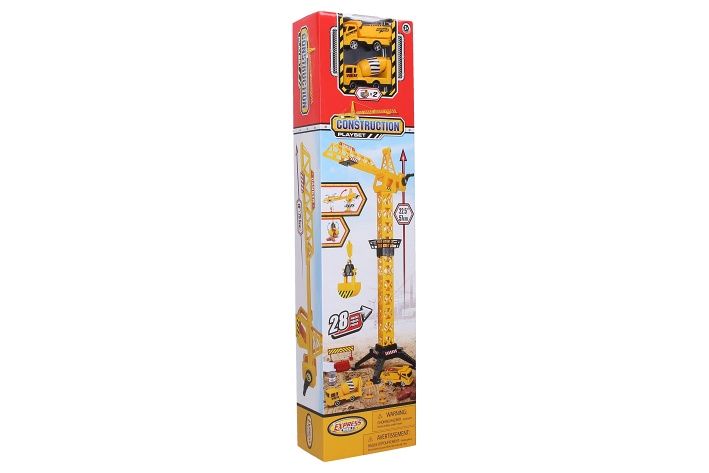 Jeřáb se 2 stavebními auty. Velikost jeřábu 57 cm. Manuální jeřáb na kliku, otočné rameno o 360 stupňů. Obsahuje jeřáb, 2 stavební auta, 2 figurky stavebníků, 2 barely, 2 závory, stavební materiál a další. Obrázkový návod na složení na zadní straně obalu.