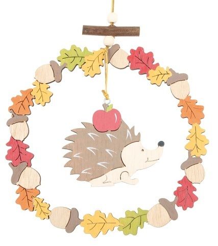 Ježek dřevěný v kruhu z listí na zavěšení 16 cm
