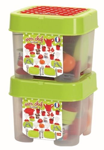 Jídelní set obsahuje vše potřebné pro nachystání pohoštění, vč. nádobí. 4 talíře, sada příborů, pohárky, hrníčky, konvička s víčkem, hrnec s víkem, ovoce, jogurt a další.