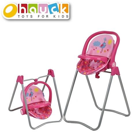 Jídelní židlička pro panenky. Panenku do židličky umístíte a může malá maminka panenku krmit nebo si sní hrát. Váha židličky 1,4 kg. Rozměry 45.5 x 34,5 x 62 cm. Šířka sedáku je 18,5 cm. Pro panenky do 43cm. Doporučený věk 3+.