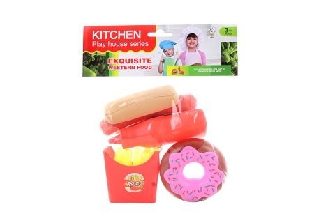 Plastová sada jídla obsahuje hot dog, hranolky v krabičce, donut a kečup. Baleno v sáčku. Rozměry balení cca 19x22x4 cm. Věk 3+