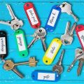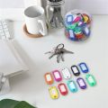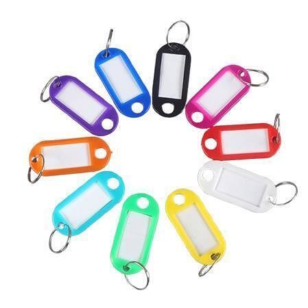 Plastové jmenovky na klíče s kovovým kroužkem a papírovým popisovatelným štítkem.