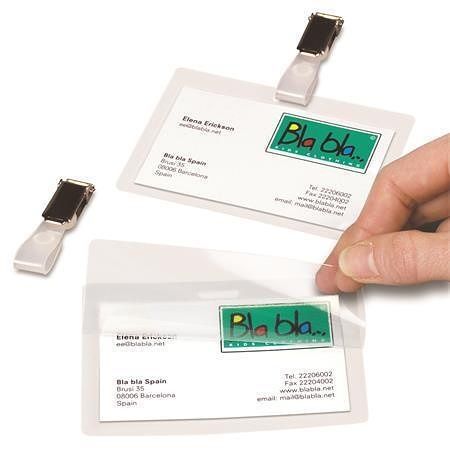 Vlastnosti: samolaminace zajišťuje, že po vložení nelze identifikační kartu nebo vizitku odstranit; jednorázové; lze použít horizontálně (10,4x7,4 cm) nebo vertikálně (7x10,7 cm); pro utěsnění je nutné odstranit ochranou fólii ze samolepícího zadního krytu, vložit přední stranu vizitky nebo identifikační karty proti průhledné tvrdé fólii a pevně ji zatlačit; ideálně pro karty nebo vizitky o velikosti 6x9 cm;