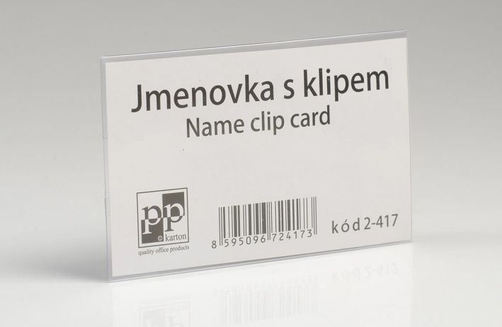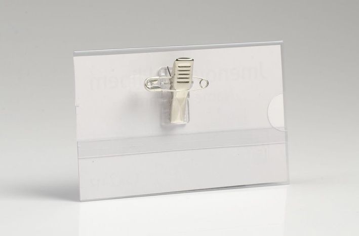 Visačka-jmenovka opatřena špendlíkem a současně i klipem k uchycení. Vhodná pro prezentace, přednášky. Vysoce průhledný polypropylen, hladký, síla 220 mic. Rozměr 9 x 5,7 cm