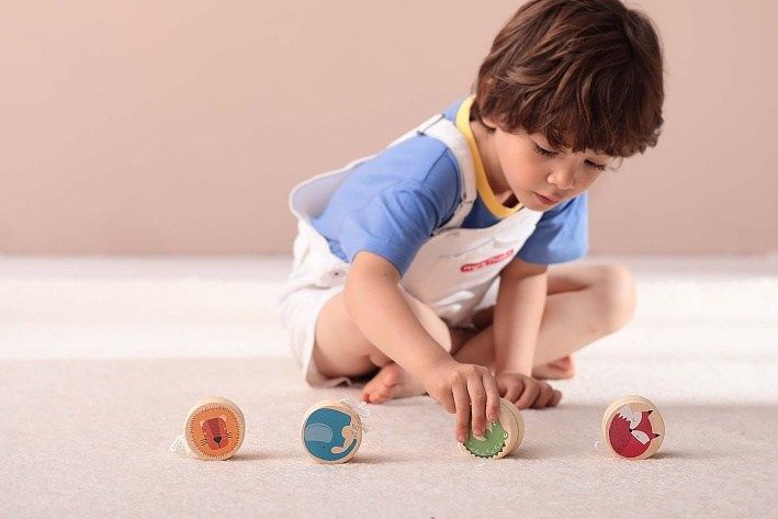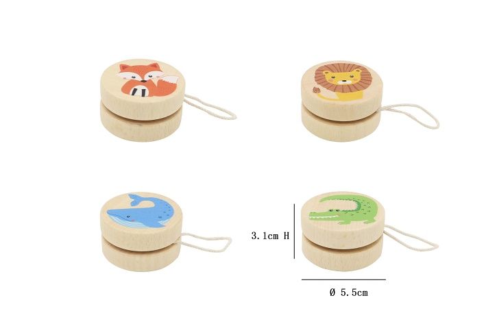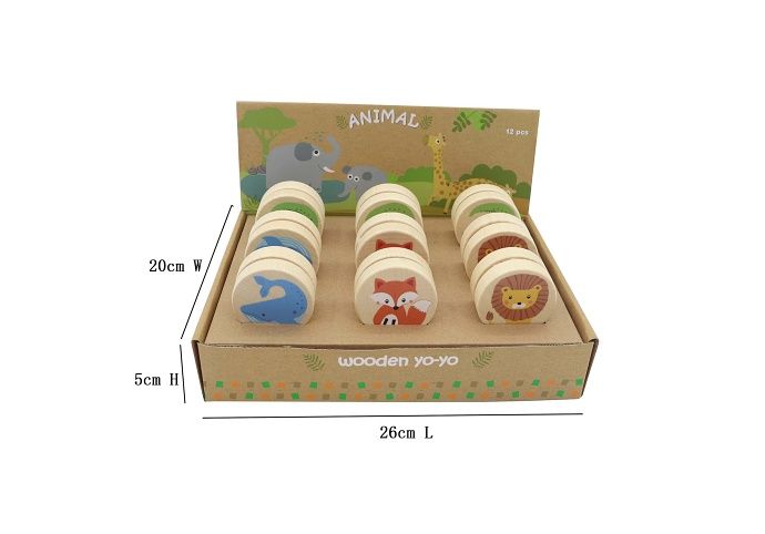 Jojo dřevěné. Rozměry 5,5x5,5x3,1 cm. 12 ks display box. 4 varianty - lev, liška, velryba, krokodýl.
