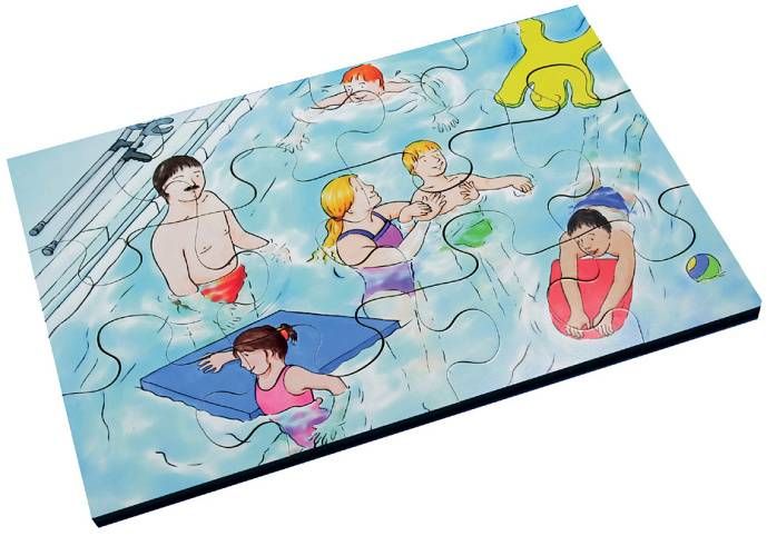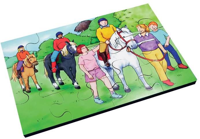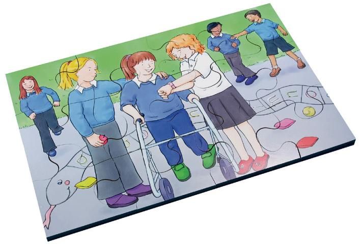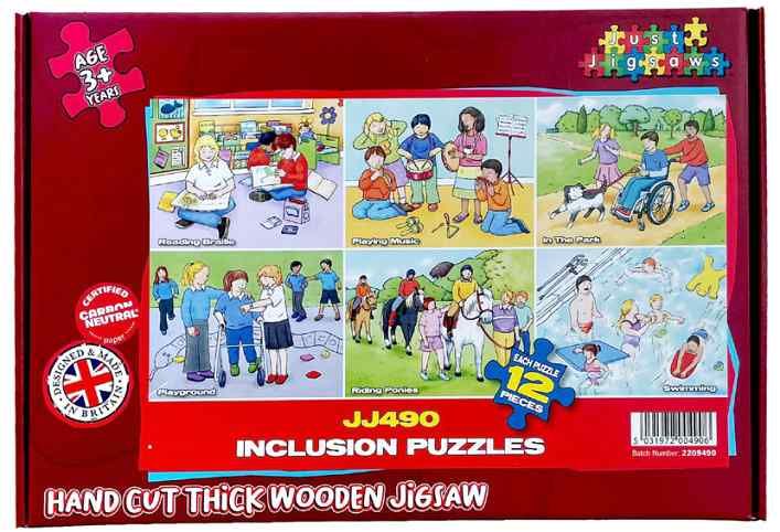 Just Jigsaws 490 Inkluze - dřevěný puzzle set 72 dílů představuje 6 různých ilustrovaných puzzle obrázků, na kterých je vždy zachyceno začlenění zdravotně hendikepovaného jedince do společnosti a snaha ostatních mu pomoci. Edukativní puzzle, které podporuje vnímání rovných šancí všech na vzdělávání a běžný život. Učí empatii, ohleduplnosti a smyslu pro pomoc. Zahrnuje tato témata: čtení, plavání, hru na hudební nástroje, venkovní hru, procházky se psem, jízdu na koni.