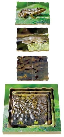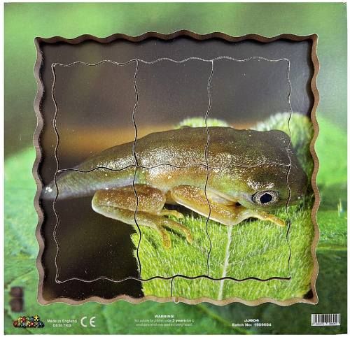 Just Jigsaws 604 Žába a její životní cyklus - dřevěné vrstvené puzzle 19 dílů. Objevujte s tímto netradičním puzzle životní cyklus žáby. Edukativní puzzle, díky kterému mohou děti zkoumat zázračné proměny přírody prostřednictvím skutečných fotografií. Vrstvené puzzle obsahuje obrázky 4 fází vývojového cyklu. K vidění jsou reálné fotky: vajíček, pulců, měnícího se pulce a dospělé žáby. Sada obsahuje celkem 18 kusů puzzle dílků a 1 základnu s rámečkem.