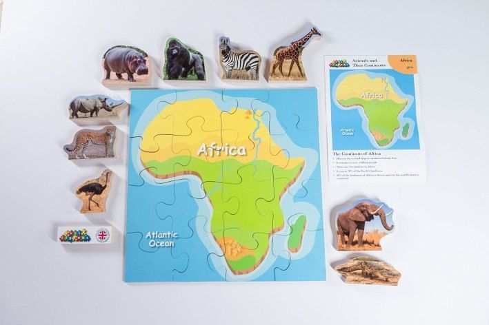 Just Jigsaws 770 Afrika a její zvířata - dřevěné puzzle 16 dílů a 10 zvířat je vzdělávací sada, jejímž smyslem je seznámit děti s jednotlivými kontinenty a jejich faunou. Cílem je správně poskládat mapu daného světadílu a pojmenovat všechna zvířata, která na něm žijí. Sada obsahuje 10 reálně vyobrazených, volně stojících zvířat na MDF desce o tloušťce 1,5 cm, 1 mapu kontinentu na MDF desce o tloušťce 0,4 cm rozřezanou na 16 kusů a informační list s jednoduchými vysvětlujícími informacemi o daném světadíle a některých jeho zvířatech. Toto edukativní puzzle je skvělou volbou pro všechny, kteří mají rádi přírodu a zároveň děti chtějí hravým způsobem připravit na budoucí hodiny zeměpisu.