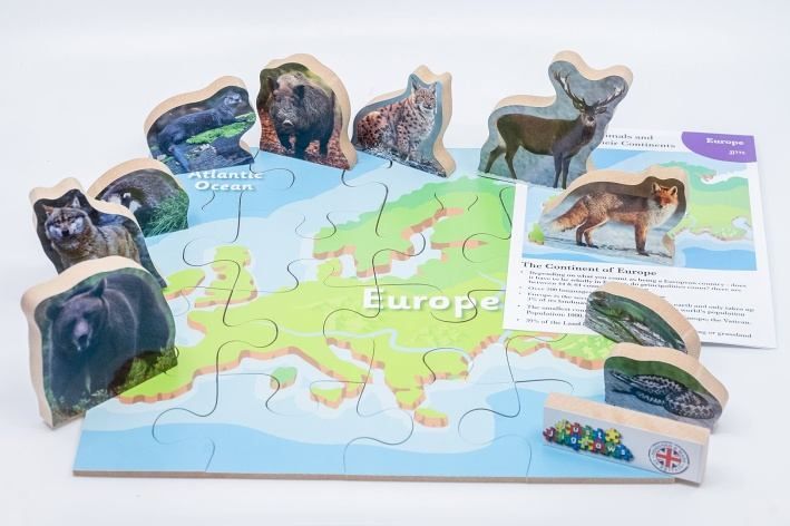 Just Jigsaws 775 Evropa a její zvířata - dřevěné puzzle 16 dílů a 10 zvířat je vzdělávací sada, jejímž smyslem je seznámit děti s jednotlivými kontinenty a jejich faunou. Cílem je správně poskládat mapu daného světadílu a pojmenovat všechna zvířata, která na něm žijí. Sada obsahuje 10 reálně vyobrazených, volně stojících zvířat na MDF desce o tloušťce 1,5 cm, 1 mapu kontinentu na MDF desce o tloušťce 0,4 cm rozřezanou na 16 kusů a informační list s jednoduchými vysvětlujícími informacemi o daném světadíle a některých jeho zvířatech. Toto edukativní puzzle je skvělou volbou pro všechny, kteří mají rádi přírodu a zároveň děti chtějí hravým způsobem připravit na budoucí hodiny zeměpisu.