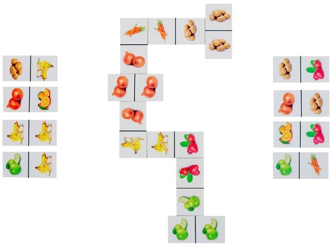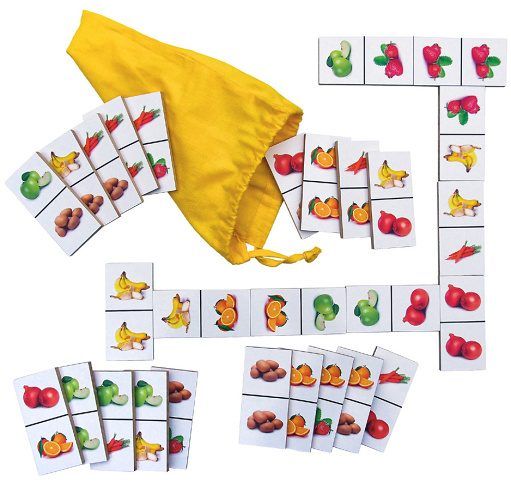 Just Jigsaws 780 Ovoce a zelenina - dřevěné domino 28 dílů představuje známou zábavnou hru pojatou však tematicky. V tomto případě hráči hrají s kartičkami, na kterých jsou reálné fotky ovoce a zeleniny, jež nahrazují běžné tečky nebo číslice. Princip hry zůstává neměnný, děti přikládají dílky stejnými obrázky k sobě. Vyhrává ten, kdo se jako první zbaví všech svých dílků. Díky reálným fotkám různých druhů ovoce a zeleniny se ale dá s touto variantou pracovat i jinými způsoby, které pro ně budou mít edukativní přínos.