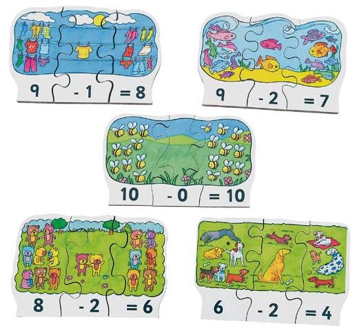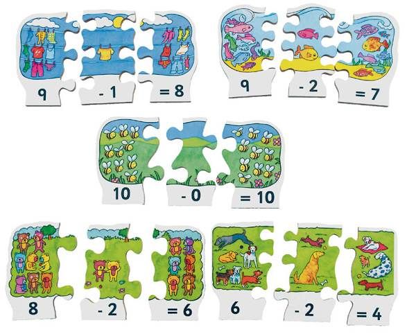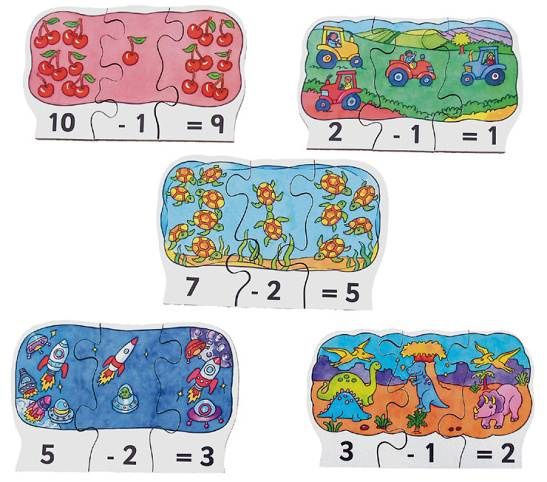 Just Jigsaws 791 Odčítání - dřevěné puzzle 30 dílů. Tato dřevěná matematická skládačka pomůže dětem procvičit jednoduché počty zábavnou formou. Nabízí 10 matematických úloh na odčítání. Na každém dílku jsou nakresleny obrázky odpovídající numerickému číslu v jeho spodní části. Úkolem je sestavit vždy k sobě 3 díly tak, aby vznikl správný výsledek. Skvělý úvod do jednoduché matematiky. Sada obsahuje 10 x 3 díly.
