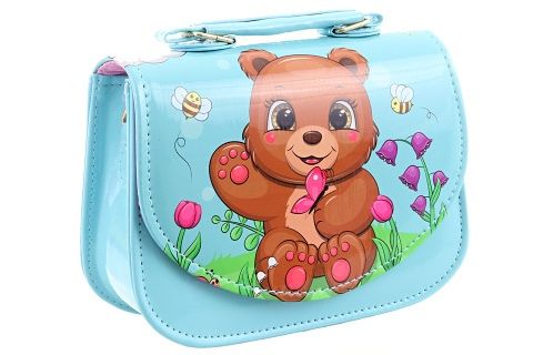 Kabelka s motivem medvídka. Lesklý materiál. Jedna kapsa, zapínání na druk. Rozměry kabelky 18x14x7 cm. Výrobek není hračka.