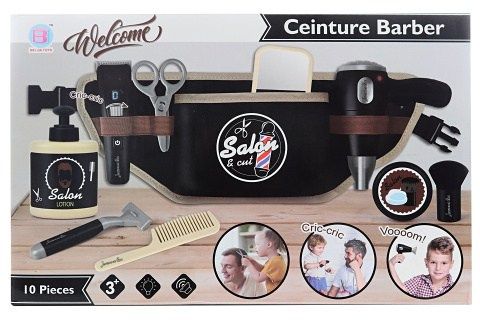 Kadeřnická sada pro kluky. Balení obsahuje látkový opasek (délka s popruhem cca 85 cm), fén a spoustu doplňků. Fén je napájen na 2xAAA baterie (nejsou součástí balení) a po zapnutí svící a vydává zvuky. Materiál plast. Baleno v krabici. Rozměry balení cca 28x18x6 cm. Věk 3+