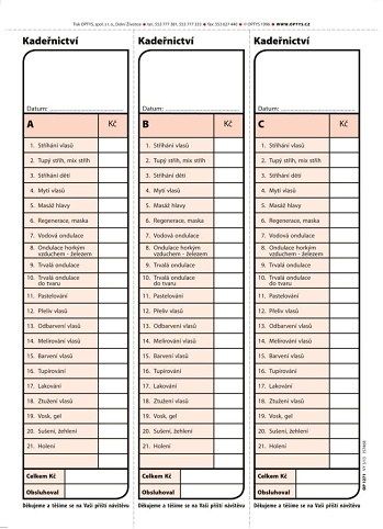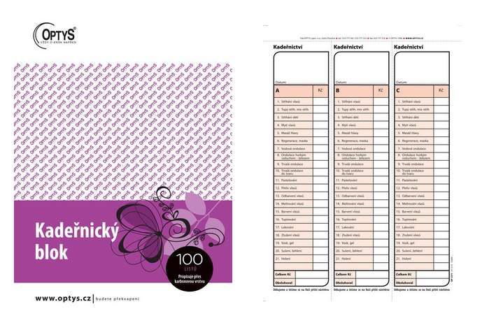 Kadeřnický blok má 100 listů, každý list má tři části. Tiskopis je ve formátu A5, nečíslovaný.