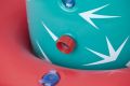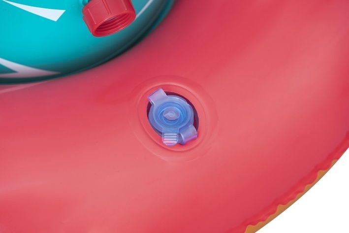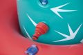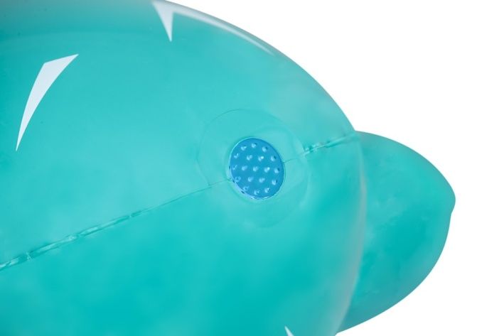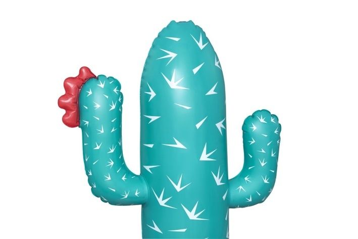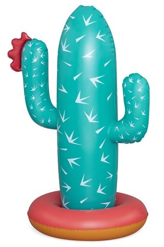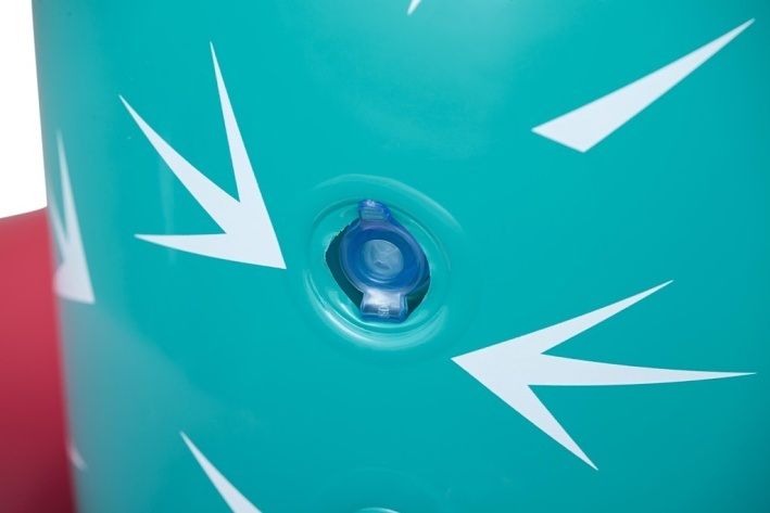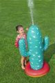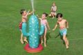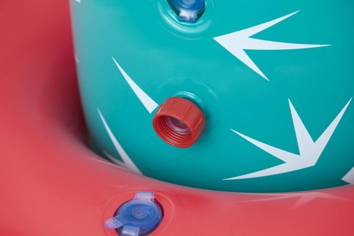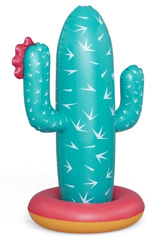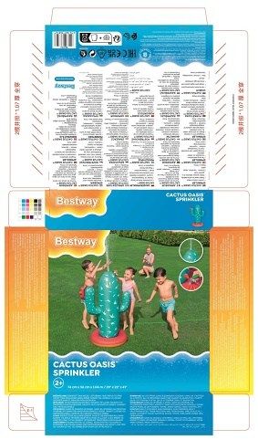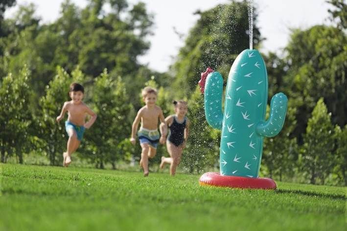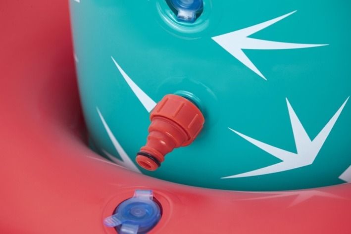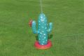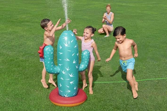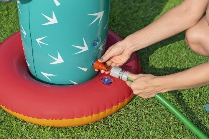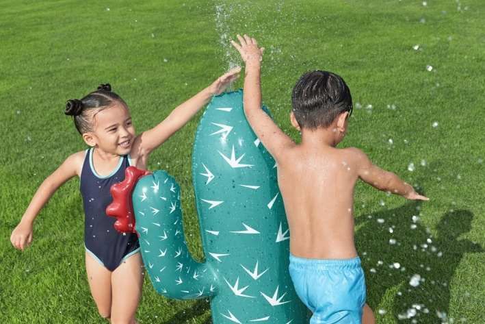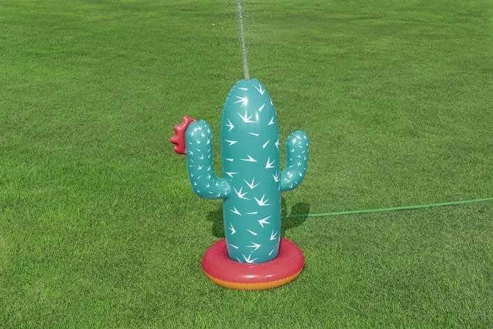 Kaktus s rozstřikovačem o rozměrech 74 × 56 × 104 cm je nafukovací venkovní hračka určená pro děti od 2 let. Tento produkt je navržen v podobě stylizovaného kaktusu v tyrkysové barvě s bílými bodlinami a červeným květem na jedné z ramen, což mu dodává veselý a hravý vzhled. Stabilitu zajišťuje nafukovací základna v červené a oranžové barvě, která se dá naplnit vodou, čímž se zabrání převrácení během používání. Materiál je odolný PVC, který je vhodný pro venkovní použití. Funkce rozstřikovače je jednoduchá a efektivní – kaktus je vybaven připojením na zahradní hadici, které je umístěno na těle kaktusu nad základnou. Po připojení hadice začne kaktus stříkat vodu z vrcholu, což vytváří zábavnou a osvěžující vodní clonu pro děti. Na základně jsou viditelné také ventily pro nafukování a vypouštění vzduchu a vody, které usnadňují manipulaci s hračkou. Díky jednoduchému systému připojení hadice je příprava k použití rychlá a snadná. Hračka je vhodná pro zahrady, dvorky nebo jiné venkovní prostory, kde děti mohou bezpečně a zábavně trávit čas při hře s vodou. Obrázky na obalu i fotografie v reálném použití ukazují, že kaktus je ideální pro skupiny dětí, které si mohou hrát společně, běhat kolem a užívat si příjemné ochlazení během horkých letních dnů. Celkově je kaktus s rozstřikovačem praktickou a hravou pomůckou pro aktivní venkovní zábavu.