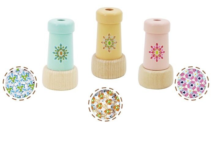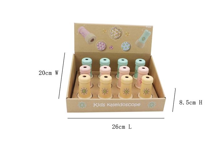 Kaleidoskop dřevěný. Rozměry 4,5x4,5x8,3 cm. 12 ks display box. 3 varianty - modrý, žlutý, růžový.