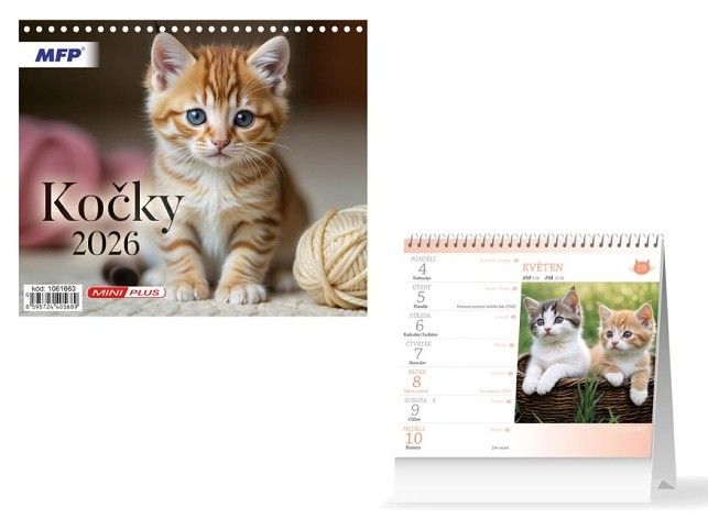 Stolní kalendář na rok 2026 mini s názvem Kočky. Kalendář je určený pro milovnice a milovníky koček. Vhodný pro zapisování důležitých poznámek, k organizování různých událostí každodenního života. Možnost dotisku firemního loga a textu na spodní stranu kalendáře.