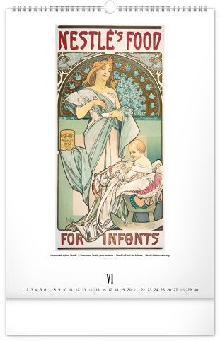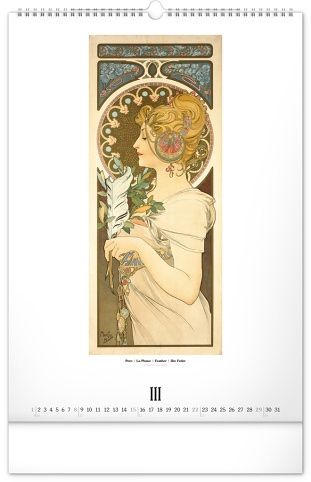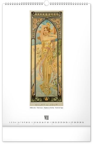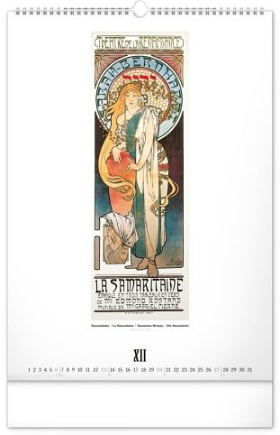 Česko-slovenský nástěnný kalendář ve velkém formátu s reprodukcemi obrazů oblíbeného secesního malíře českého původu.