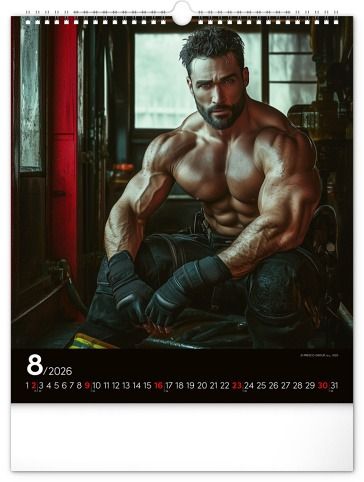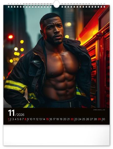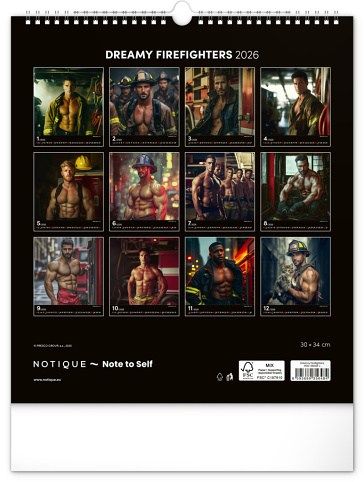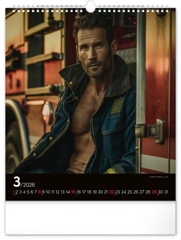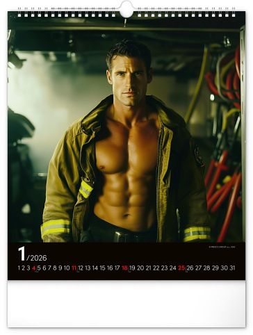Dvanáct měsíců, dvanáct charismatických hasičů, kteří rozpálí nejednu stěnu! Užijte si pohled na vypracovaná těla v kalendáři plném žáru a stylu. Nechybí jednoduché kalendárium se zvýrazněnými nedělemi na černém pozadí.