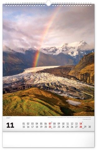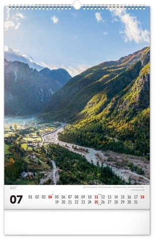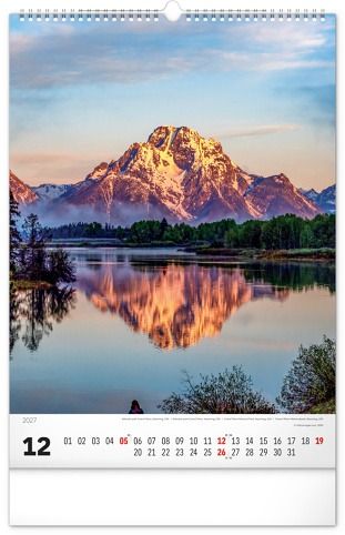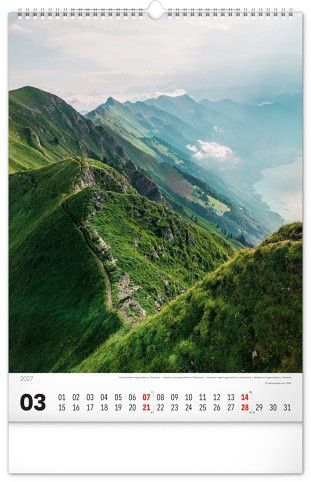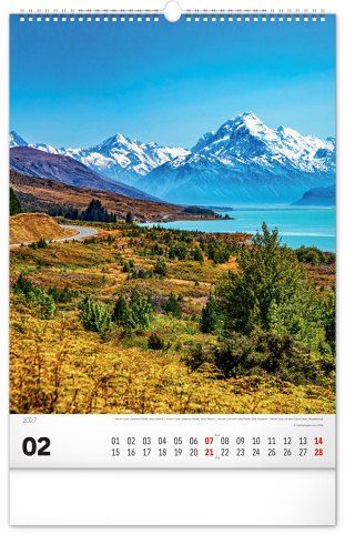 Nástěnný kalendář v atraktivním výškovém formátu obsahuje fotografie majestátních hor z Nového Zélandu, Islandu, Švýcarska nebo Kanady. Fotografie jsou doplněny jednoduchým kalendáriem.
