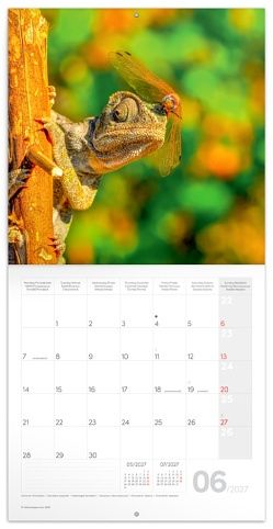 Každý měsíc budete obdivovat jiného zástupce plazí říše, který jako by pamatoval dinosaury. V kalendáři kromě fotek najdete přehledné kalendárium od září 2026 do prosince 2027 v šesti jazycích, měsíční fáze, důležité svátky a prostor pro poznámky na každý den.