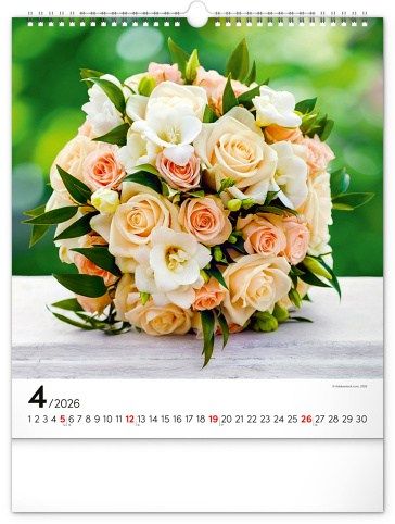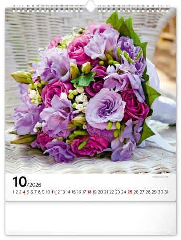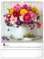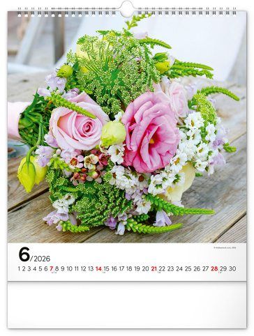 Fotografie pestrobarevných květin a originálních vazeb v nástěnném kalendáři na výšku. Fotografie doplňuje univerzální kalendárium na bílém pozadí.