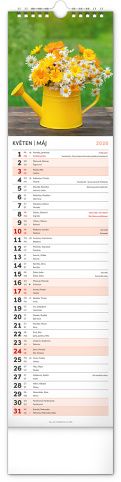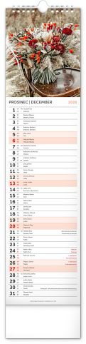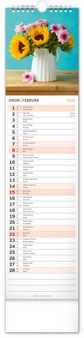 Okrasné květiny a květinová aranžmá na stránkách nástěnného kalendáře v praktickém kravatovém formátu, který se vejde opravdu všude. V česko-slovenském kalendáři je rovnocenně zahrnuta čeština a slovenština, česká a slovenská jména, svátky, památné dny i měsíční fáze. V každém dni je prostor pro poznámky.