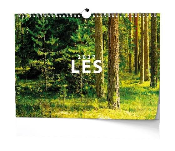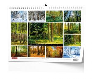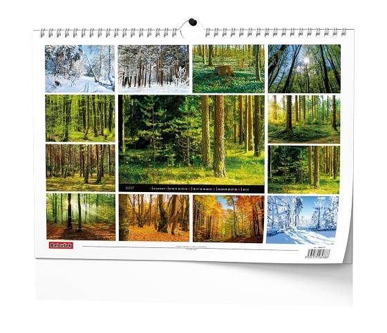 Nástěnný kalendář s obrázky působivých lesních scenérií.