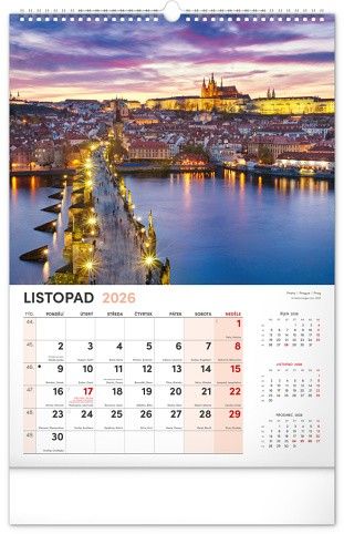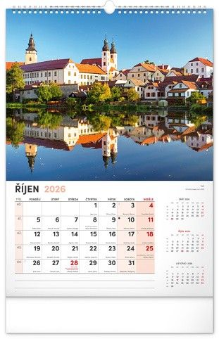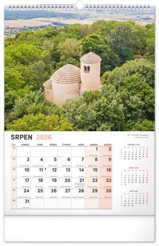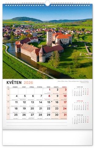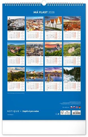 Kalendář s fotografiemi z nejkrásnějších míst České republiky. Praha, Kutná Hora, Olomouc a další skvosty v kalendáři s tématem Má vlast ve výškovém formátu s popisky a jednoduchým kalendáriem.