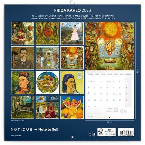 Ponořte se do světa malířky, jejíž život i tvorba se staly symbolem odvahy a osobitého umění. Obrazy ikonické umělkyně Fridy Kahlo na stránkách poznámkového kalendáře. Obsahuje přehledné kalendárium od září 2025 do prosince 2026 v šesti jazycích, měsíční fáze, důležité svátky a prostor pro poznámky na každý den.