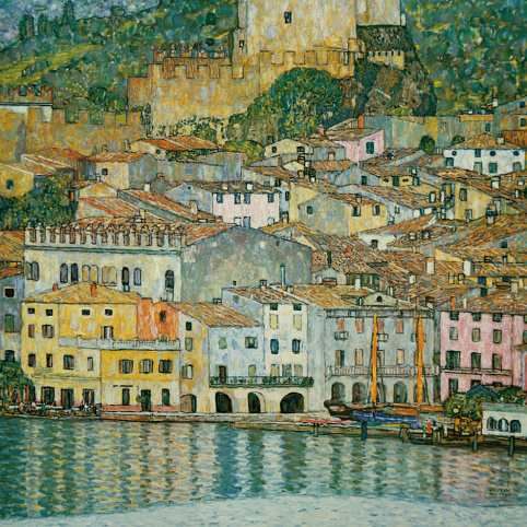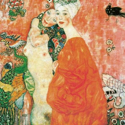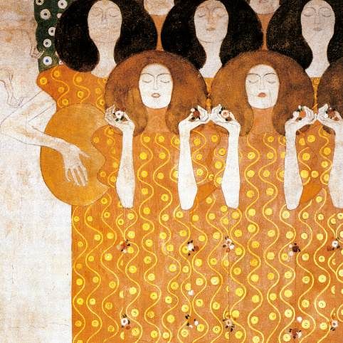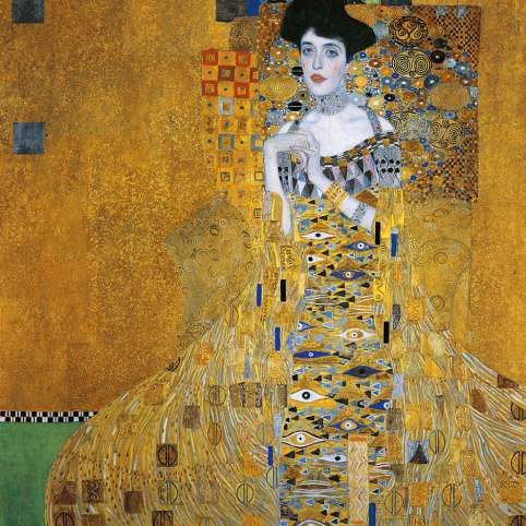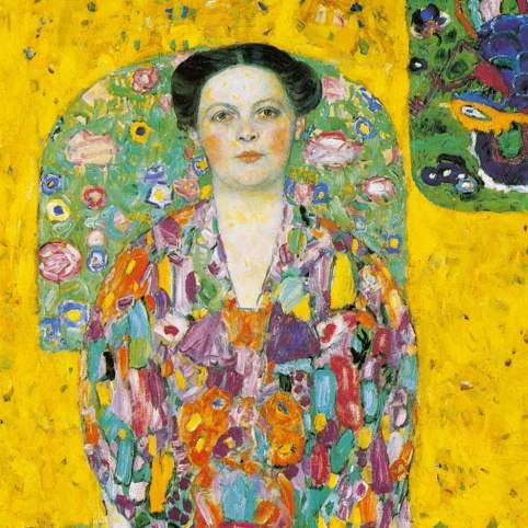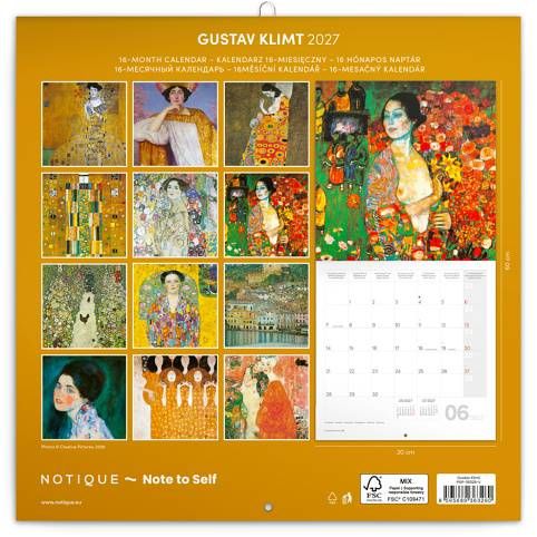 Obrazy populárního secesního malíře Gustava Klimta na stránkách poznámkového kalendáře. Ten obsahuje přehledné kalendárium od září 2026 do prosince 2027 v šesti jazycích, měsíční fáze, důležité svátky a prostor pro poznámky na každý den.