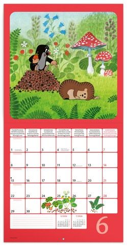 Krteček – postava mnoha kreslených příběhů Zdeňka Milera, které obletěly celý svět. Poznámkový kalendář s ilustracemi z pohádek doplňuje přehledné kalendárium od září 2025 do prosince 2026 v osmi jazycích, měsíční fáze, důležité svátky a prostor pro poznámky na každý den.