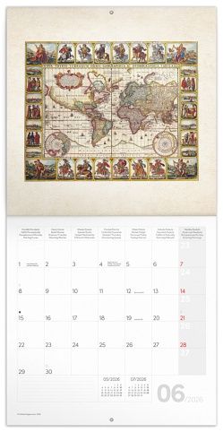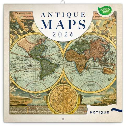 Dvanáct ilustrací starých map v praktickém poznámkovém kalendáři. Kalendář obsahuje přehledné kalendárium od září 2025 do prosince 2026 v osmi jazycích, měsíční fáze, důležité svátky a prostor pro poznámky na každý den. Kalendář je součástí kolekce Plastic Free, je zabalený v obálce z recyklovaného papíru a vytištěný na recyklovaném strukturovaném papíře s vysokou gramáží.