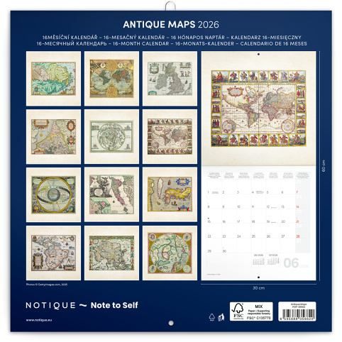 Kalendář nástěnný poznámkový Staré mapy 2026, 30 x 30 cm / PGP-35662