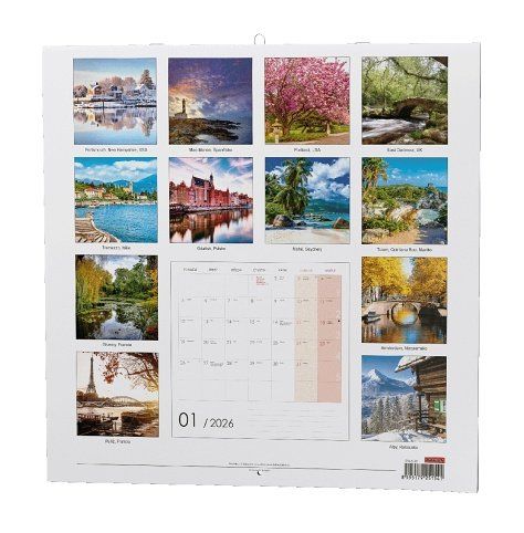 Nástěnný kalendář s měsíčním kalendáriem, v moderním formátu LP desky s kouzelnými obrázky romantických míst.