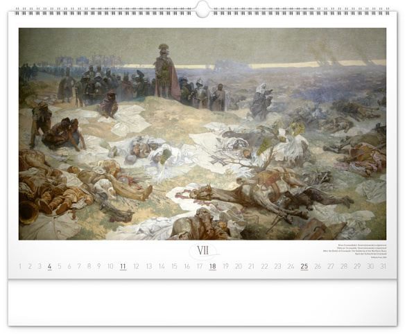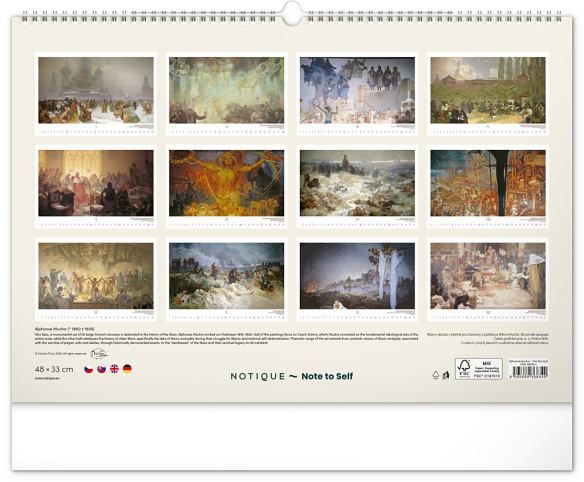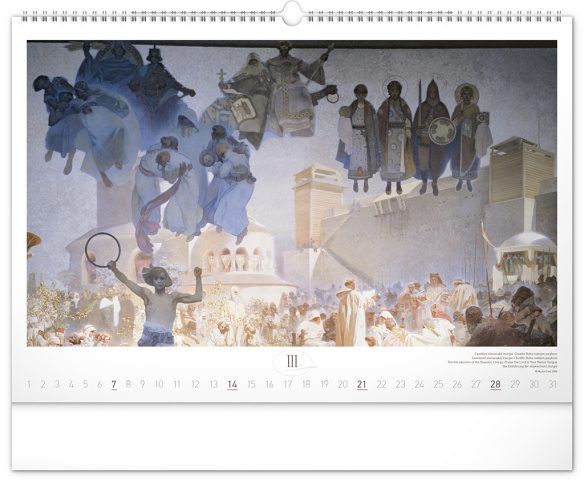 Nástěnný kalendář s reprodukcemi známých obrazů Slovanské epopeje od českého secesního malíře Alfonse Muchy. Reprodukce doplňuje vkusné univerzální kalendárium s vyznačenými nedělemi a popisky obrazů ve čtyřech jazycích (CZ, SK, EN, DE).