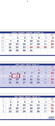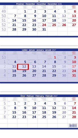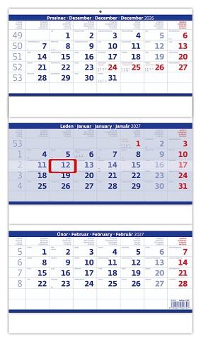 Kalendář nástěnný Tříměsíční skládaný modrý 2027, 31,5cm x 55,5cm, N208-27