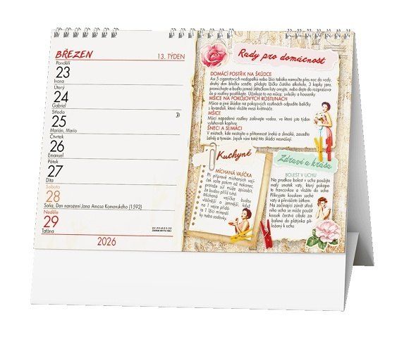 Stolní kalendář s týdenním kalendáriem a s tipy a triky pro domácnost.