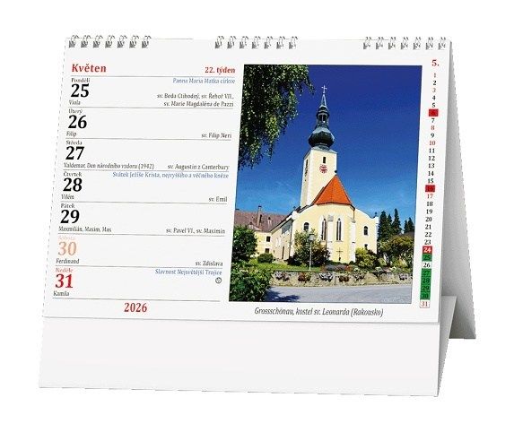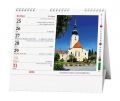 Stolní kalendář s týdenním katolickým a občanským kalendáriem s obrázky kostelů a kapliček.